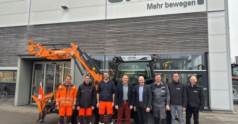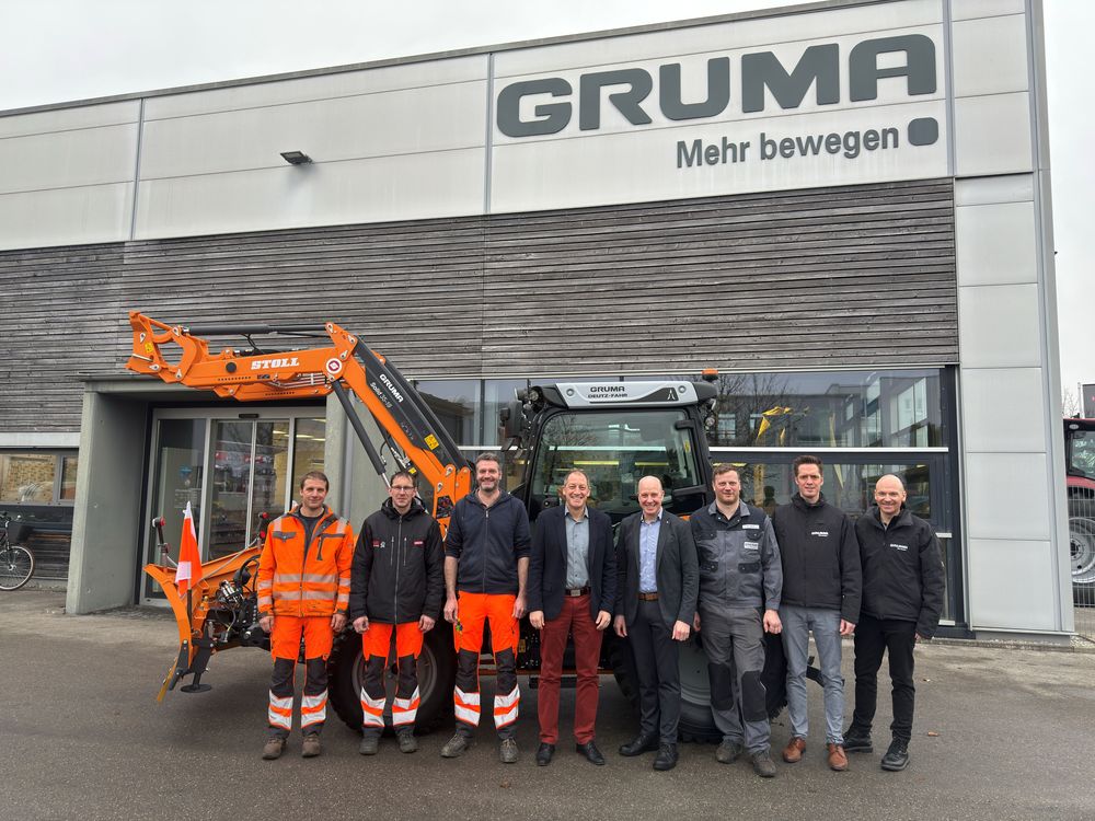 Auf dem Bild von links: Mitarbeiter des Bauhofes Tobias Dopfer, Michael Weber und Bauhofleiter Benjamin Biechele, Bürgermeister Helmut Bucher, von der Firma Gruma Geschäftsführung Herr Moser, Werkstattleiter Herr Stich, Verkaufsleiter Herr Walter sowie Verkaufsbeauftragter Herr Schuster.